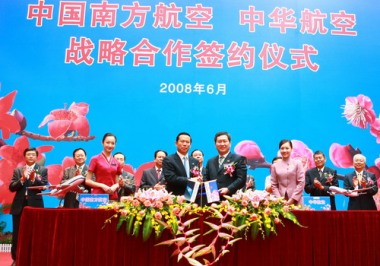 6月23日,在两岸周末直航包机即将开启之际,祖国大陆最大的航空公司中国南方航空公司和宝岛台湾最大的航空公司中华航空公司,在广州签署战略合作备忘录,双方宣布进一步加强业务和战略合作,为两岸同胞提供更便利、更优质的服务。中国南方航空集团公司总经理、南航股份公司董事长刘绍勇、中华航空公司董事长赵国帅和中国民航局、广东省台办、广东旅行社代表等近百位嘉宾见证了签约仪式。