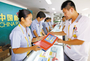 图为设在天津水滴奥林匹克中心的邮政局聚集了许多前来观看球赛、购买奥运邮品的观众。