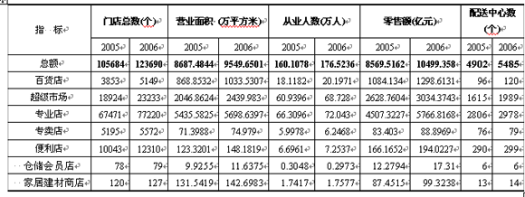 随着中国零售业对外开放的加深,连锁经营方式在中国迅速发展起来;而且国外先进的各种零售业态也先后进入我国,超级市场、便利店、专卖店、等新的业态形式层出不穷。1996年上海、北京连锁企业实现的销售额占当地社会商品零售总额的比重分别达到30%和18%。2003年底,全国各种形式的连锁公司已达5000多家,经营网点100000多家,2003年销售额增长52%。2002年限额以上连锁零售业销售额在零售业销售总额中所占的比重为31.28%,2003年这个比重就上升到40.03%;2002~2006年,限额以上连锁零售业销售额分别达到2658.3亿元、4258.6亿元、5580.7亿元、12587.8亿元、15548.9亿元,连锁零售业在我国零售业中的地位越来越重要。2006年,限额以上连锁零售业门店总数123690个,营业面积9549.7万平方米,从业人员176.5万人,销售额15548.9亿元,零售额10499.4亿元 。