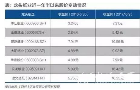 《财经》根据二级市场股价,计算出了多家龙头纸企近一年半以来的股价变动情况。统计如下: