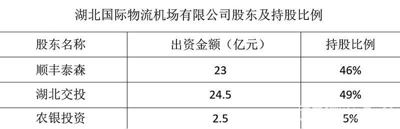 机场合资公司注册资本为50亿元人民币,各方以现金出资。其中,顺丰泰森、湖北交投、农银投资分别持股46%、49%、5%。
