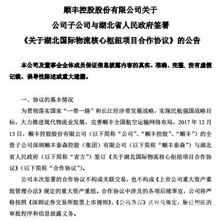 顺丰的分工。根据三方签订的《关于湖北国际物流核心枢纽项目合作协议》,湖北省将与顺丰充分发挥各自优势,按照合作共建、互惠共赢的原则,共同推进湖北国际物流核心枢纽项目建设。