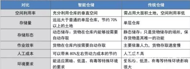 物流仓储发展主要经历了人工仓储、机械化仓储、自动化仓储、集成自动化仓储、智能自动化仓储五阶段。 智能仓储与传统仓储相比,从空间利用率、作业效率、人工成本等指标来看,优势显著,降本增效明显,智能仓储将是未来的发展方向。
