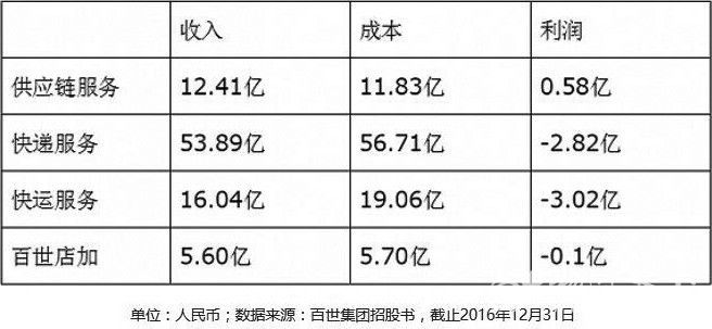 唯有供应链业务盈利。而从另一张图中可以看到,除了优势板块供应链业务有盈利,其他快递、快运和店加业务都在2016年亏损。