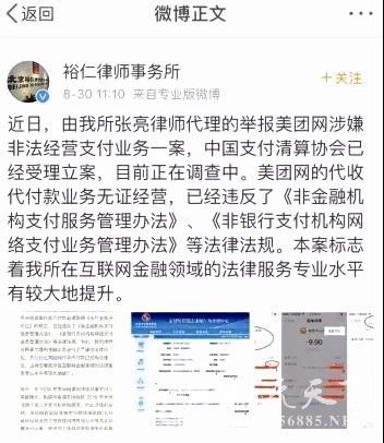 北京裕仁律师事务所发布消息称,近日,由裕仁律师事务所张亮律师代理的举报美团网涉嫌非法经营支付业务一案,中国支付清算协会已经受理立案,目前正在调查中。