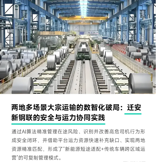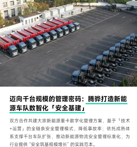 本年度我们深耕新能源大宗物流领域,通过AI算法与‘技术+运营’全链条体系,将安全管理从‘模糊判断’推向‘精准防控’,大幅降低事故率;以此为底座,通过业财一体与运力协同能力,支撑了客户千台级新能源车队的规模化扩张与高效运营。